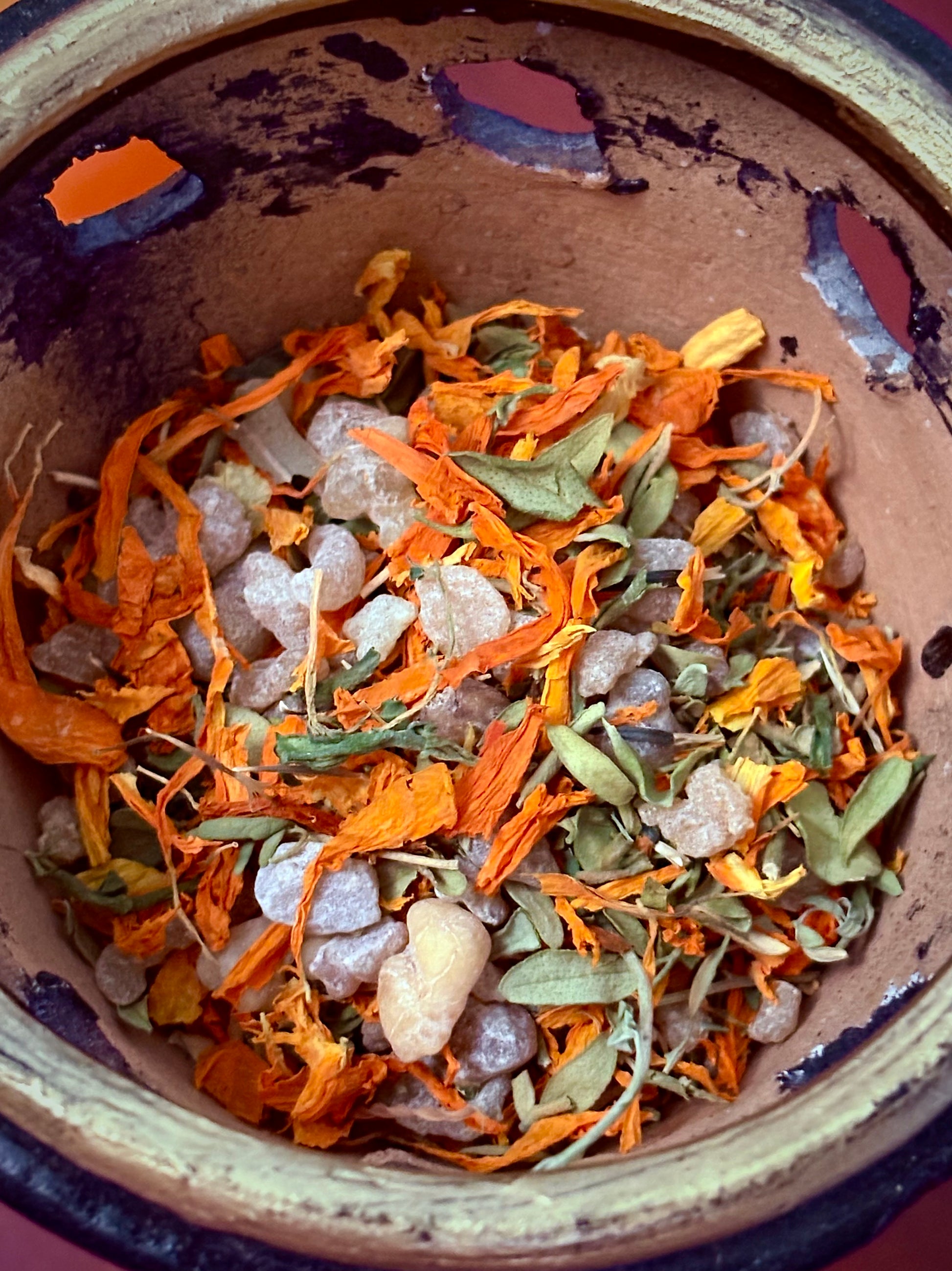 A seasonal blend of Rue, Frankincense, & Marigold, chosen for their cleansing and protective properties. -